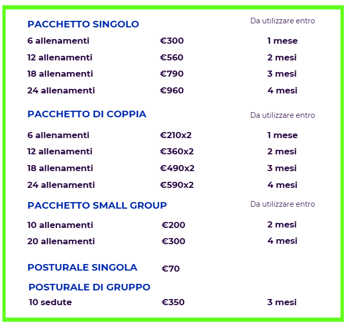 N.B. Gli allenamenti non disdetti almeno 24 ore prima verranno considerati effettuati